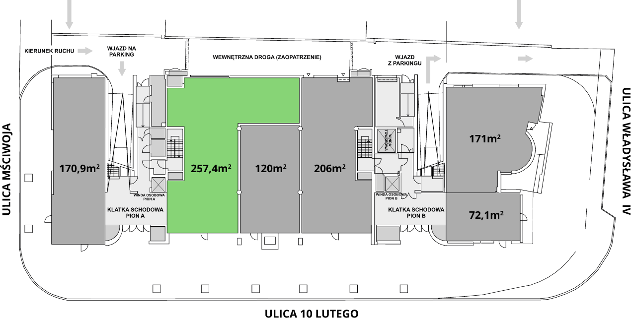 o pow. całkowitej 257,40 m2, położony na parterze budynku z niezależnym wejściem oraz dużą witryną od ul. 10 Lutego.